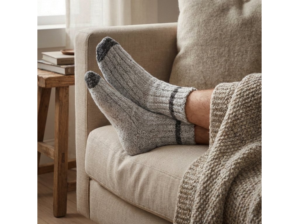 Ponožky jsou vyrobeny z kvalitní merino vlny, která je přirozeně hřejivá, prodyšná a příjemná na nošení. Merino vlna pomáhá udržovat optimální teplotu – zahřeje v chladných dnech a zároveň odvádí vlhkost, takže se budete cítit pohodlně doma, na chalupě i na zimní procházce.